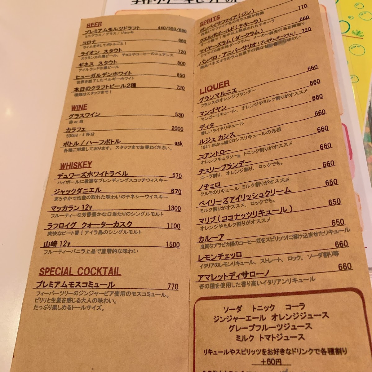 カフェラテ アイス/ホット カプチーノ アイス/ホット エスプレッソ アメリカーノ(ダブル) アイス/ホット オレンジジュース グレープフルーツジュース ランチ生ビール ランチワイン赤白